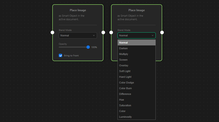 The Place Image node takes an image file and inserts it directly into your currently active Photoshop document as a new Smart Object layer.
