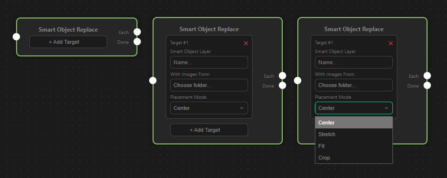 You can configure the node to replace one or multiple Smart Objects simultaneously within your active Photoshop document. Click “+ Add Target” to add a new replacement rule.